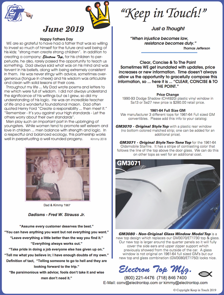 Electron Top kicks off its June issue of “Keep in Touch!” with a nod to fathers, particularly the late, great Fred W. Strauss Jr., founder of the company.