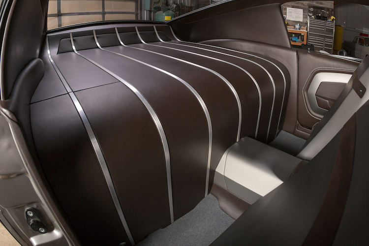Using aluminum, composites and fiberglass they built a cascading structure with hidden storage compartments behind the front seats. The structure was built in two pieces so that it could be removed from the vehicle and upholstered in leather.