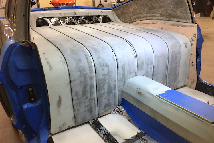 “When the dash was mounted in the car we were then able to configure and wire up the gauges and switches. We also had to mount the A/C system and run the lines to the vents that we installed in the dash. Once we had every dash component mounted in place, we lightly body-worked the surface and painted it in primer.”