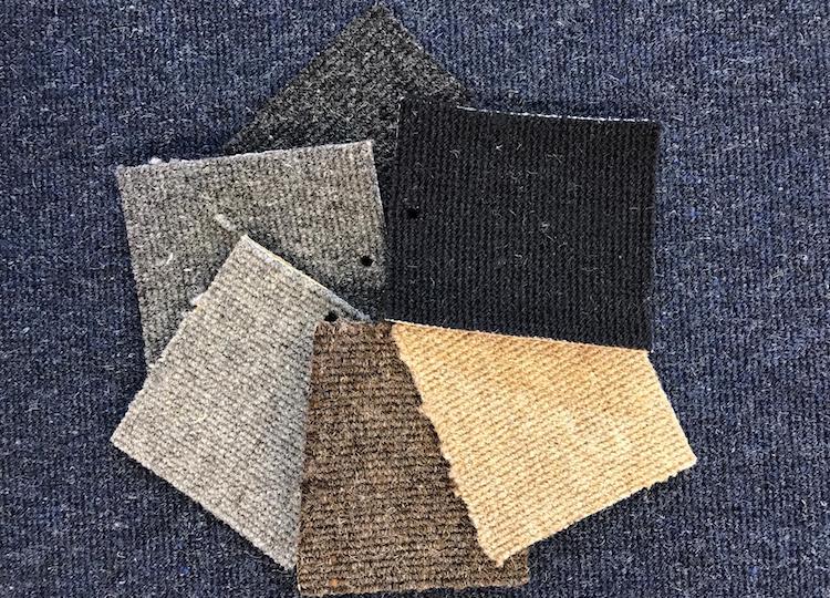 The 100% wool, short-pile carpet is available in seven heathered color schemes: black, mocha, slate grey, light grey, tan, navy and charcoal.