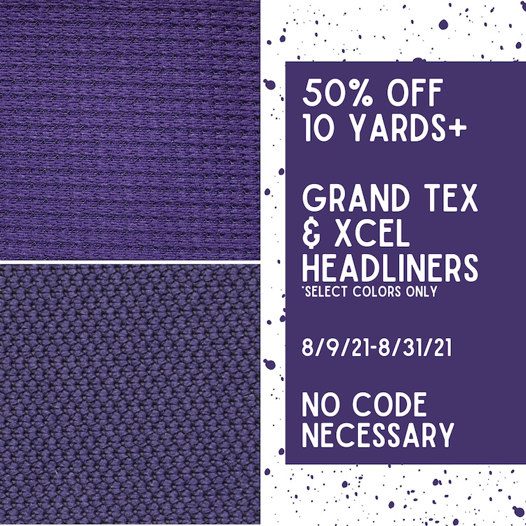 From August 9 – 31, take 50% off 10+ yards of most Grand Tex and Xcel headliner fabric. No code necessary!