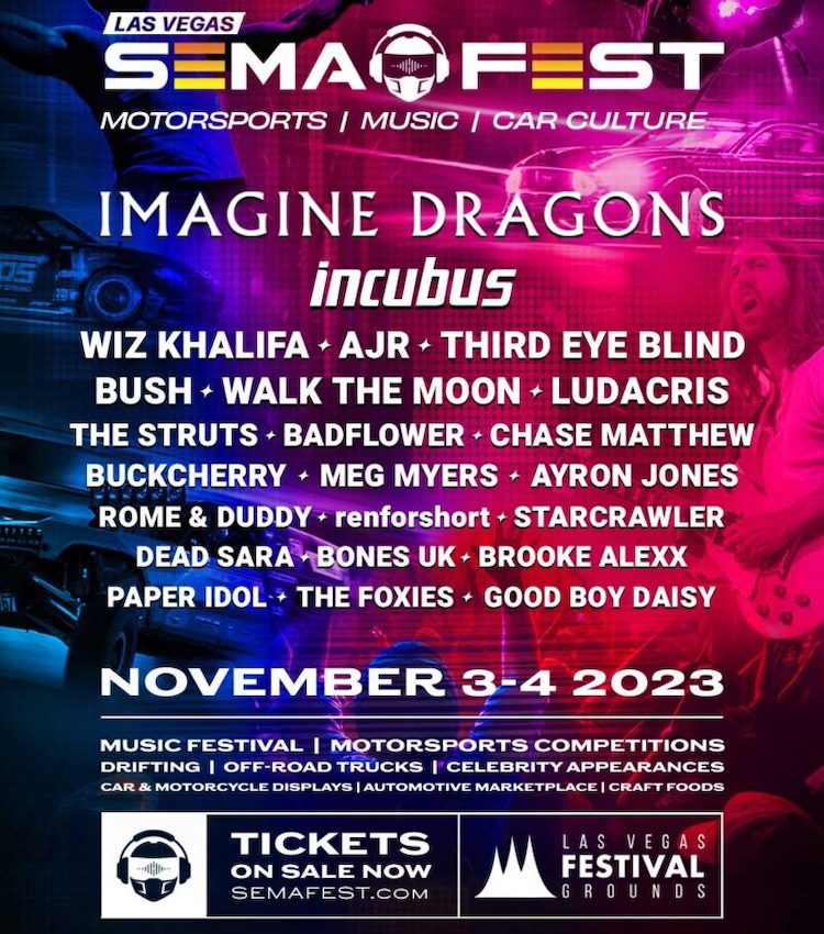 SEMA Fest, a two-day car and music festival following the automotive trade show, will be open to the public and include other big acts, such as Incubus, Ludacris, Bush, AJR and Third Eye Blind.